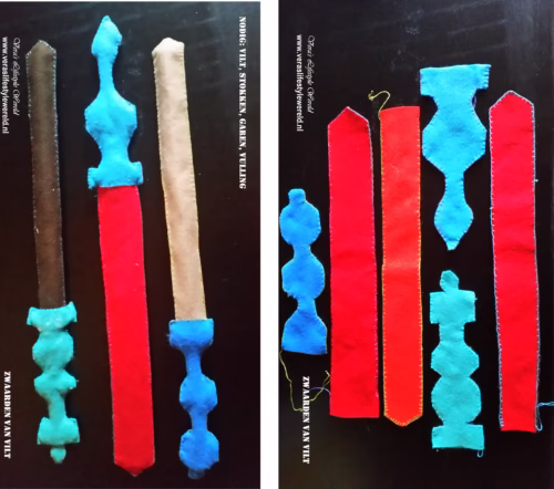 Wil je net even wat anders voor stoere kids? Zwaarden en messen zijn vrij eenvoudig te maken met wat materiaal dat je thuis hebt liggen. Recycle dus gewoon je spullen, voordat je het definitief wegdoet. Voor deze zwaarden zijn verschillende kleuren vilt gebruikt, zodat het een vrolijk geheel vormt. Met wat (borduur)garen, (bamboe)stokken en oude lappen stof als vulling ben je er eigenlijk al. Het resultaat mag er zijn: vrolijke zwaarden die zacht zijn en lekker in de hand liggen.